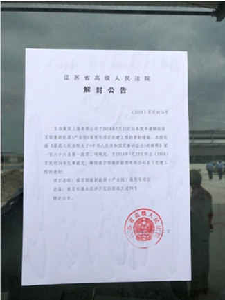 今日,扬子晚报记者到溧水经济开发区南京银隆产业园进行深入调查,发现网传“封条”已经被撕了,取而代之的是《江苏省高级人民法院解封公告》。据了解,上午9点多法院工作人员到产业园进行现场解封。《江苏省高级人民法院解封公告》内容大概内容如下,合作方于2018年7月21日向法院申请解除南京银隆商用车项目在建工程的查封措施,2018年7月22日作出判定,解除查封。