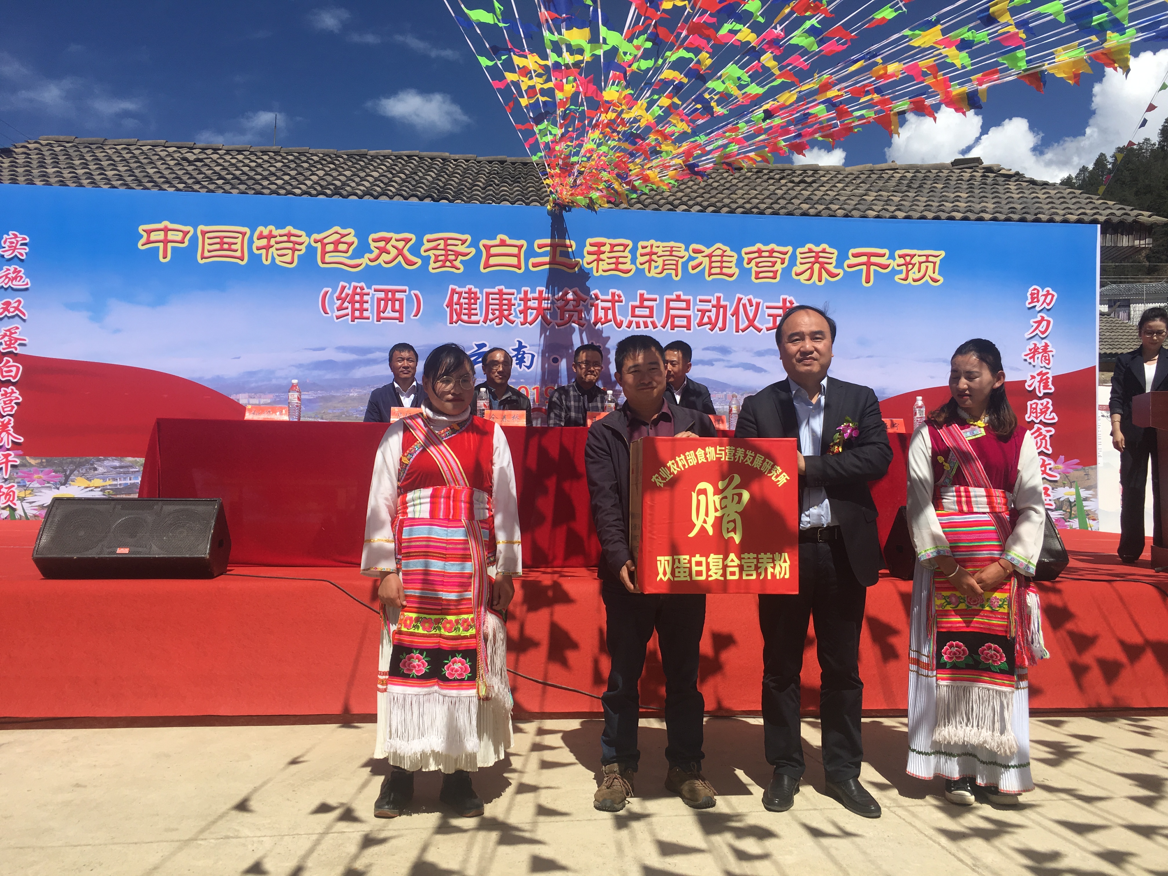 为了更好地惠及营养缺乏的重点人群,积累双蛋白健康扶贫的科学数据和案例,使双蛋白新型营养健康食品在维西县、迪庆州乃至全国范围的脱贫攻坚中发挥更大更好的作用,农业农村部食物与营养发展研究所和云南省维西傈僳族自治县人民政府签署了《中国特色双蛋白工程 消除因病致贫营养干预行动——中国直过民族精准营养干预(维西)健康扶贫试点》合作协议,并于4月11日在维西县攀天阁乡美洛村正式举行了试点启动仪式。