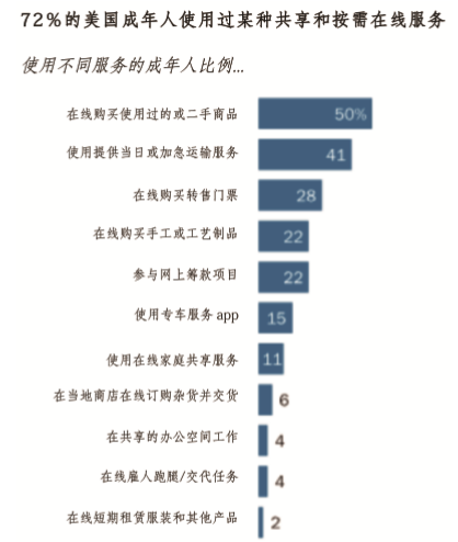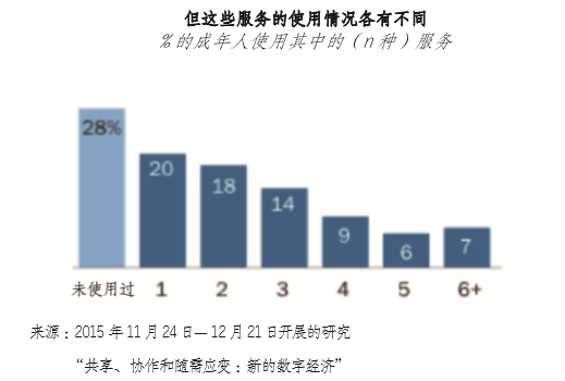 皮尤研究中心以4787名美国成年人为样本,展开了有关共享、协作和随需应变经济的范围及影响的第一个国家级综合研究。研究发现,这些平台的使用在不同的人群间大不相同。共有72%的美国成年人使用过11种不同的共享和按需服务。