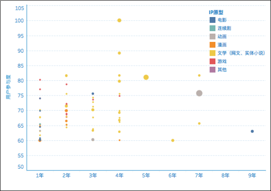 图2:海外传播时间、产品数量和用户参与度之间的关系。圆点代表该IP产品数量多少,点越大、数量越多