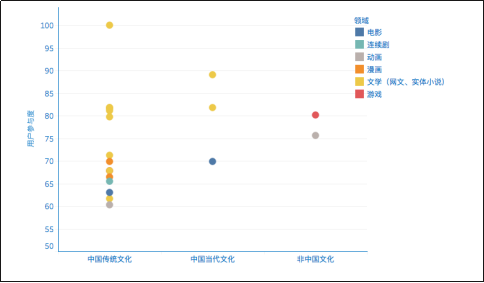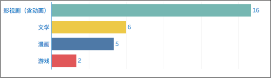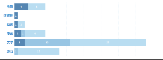 电影IP具备的中国元素最为明显。文学IP以玄幻、仙侠类型为主,虽或多或少含有中国传统文化元素,但其故事核心仍为西方魔幻、游戏等打怪升级的模式,也有西方文化色彩的名称、词汇,并未对中华优秀传统文化和当代中国发展理念的传播起到更显著的作用。