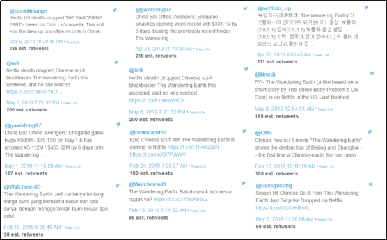 《流浪地球》相关推文转发量最高的是Netflix上架该片的消息。Netflix在全球范围内有较高的市场占有率和知名度,这类强势渠道对于提升中国影视产品的知名度有极大帮助。