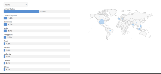 虽然美国是全球竞争最激烈的游戏市场,但是《王者荣耀(国际版)》在这里的评论最多、热度最高,远超其他国家地区。其次是英国、印尼、印度等,分布较为广泛。