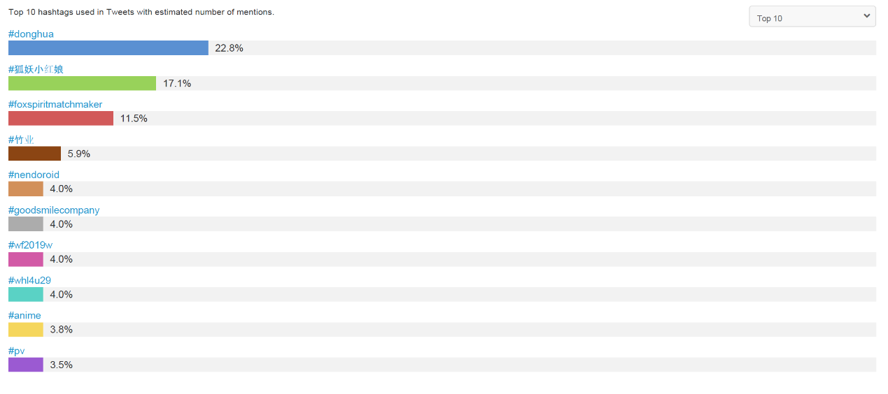 与《狐妖小红娘》同时出现的占比较高的话题标签,最突出的是“动画”的拼音标签“donghua”。“donghua”是海外用户对中国动漫的统称;《狐妖小红娘》竹业篇占比5.9%;此外还有将于2019年发售《狐妖小红娘》黏土手办的日本玩具公司Good Smile Company。